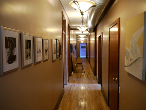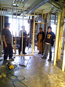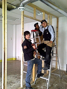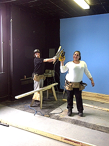 Hangout area with paintings Work in progress Cleaning the floors Hallway with retro lighting Xhift Media office Stairs to Windhover Ladies working the power tools Some unfinished rooms A new room created painting away Workin and stoppin for a pic Three spaces